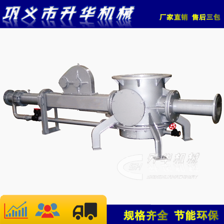 氣力輸送設(shè)備料封泵由進氣部分、擴散混合室、出料部分組成。進氣部分由進氣調(diào)節(jié)、活動風(fēng)管、調(diào)整機構(gòu)、噴嘴等組成。擴散混合室由泵體、氣化裝置、上部落灰斗組成,出料部分由擴壓器(減縮管、減擴管)出灰短節(jié)組成。